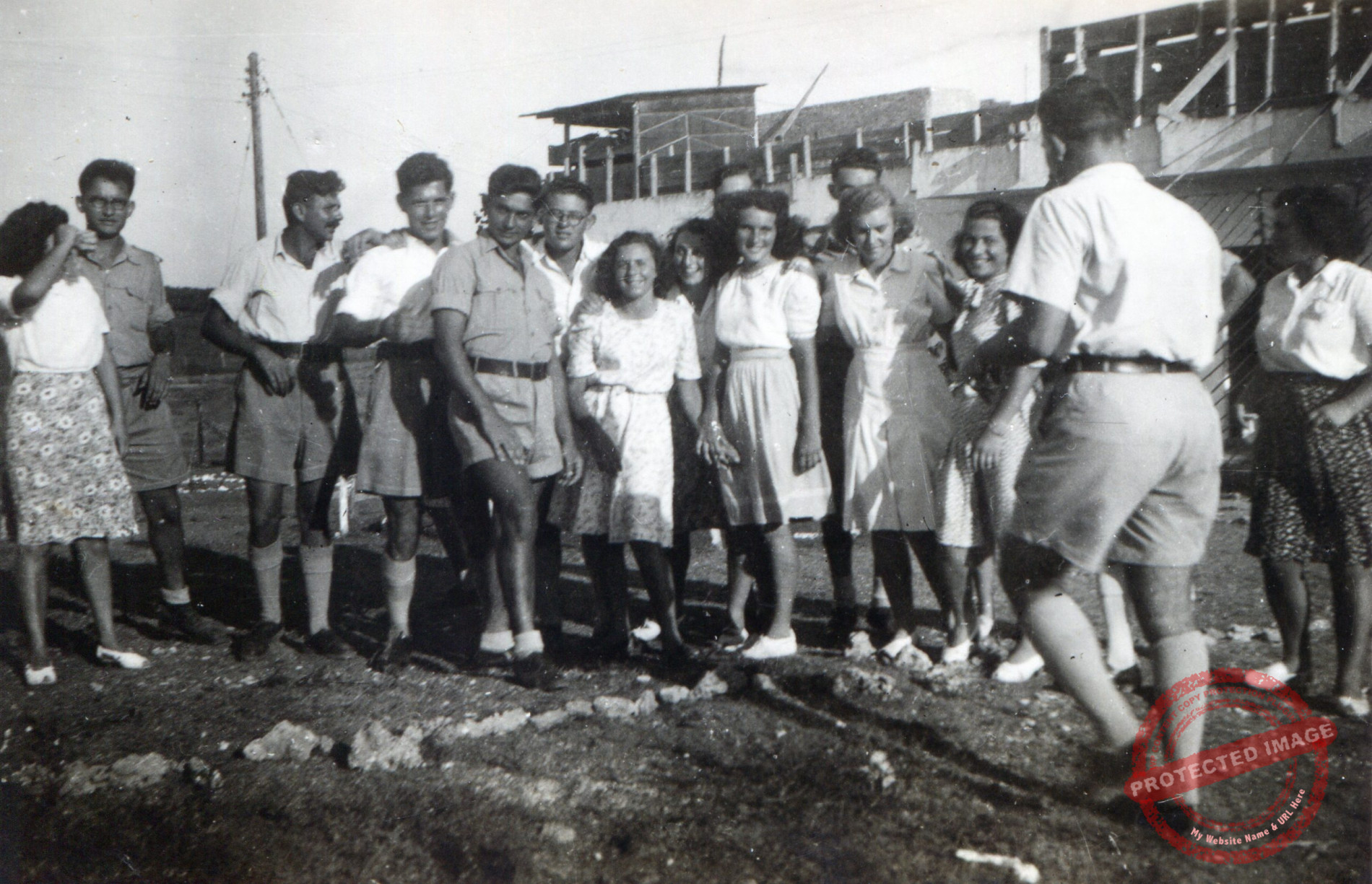 הגנה נוטרים 16 הנוטרים חוגגים עפ בנות ויצ"ו נחלת יצחק. ניתן לראות בתמונה את הגג ועמדות השמירה בתחנה. משמאל: זרובבל וולמן (שלו) חובש משקפיים, מרדכי ("ג'דה") קסוינר (עופר), בנימין פיש, יחיאל פרסיל, אליעזר ("פיטוסטה") דובדבני ורן אלדמע עם הגב למצלמה. → הגנה נוטרים 15הגנה נוטרים 17 ←