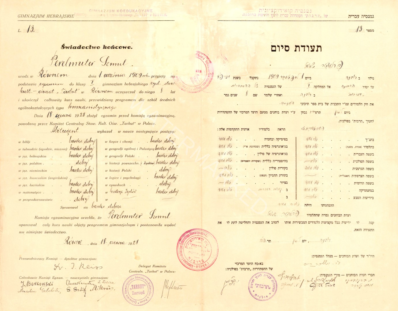 ל' סיון תרפ"ח (18 ביוני 1928), תעודת סיום הגמנסיה העברית, מחזור ראשון, התלמיד שמואל פרלמוטר.