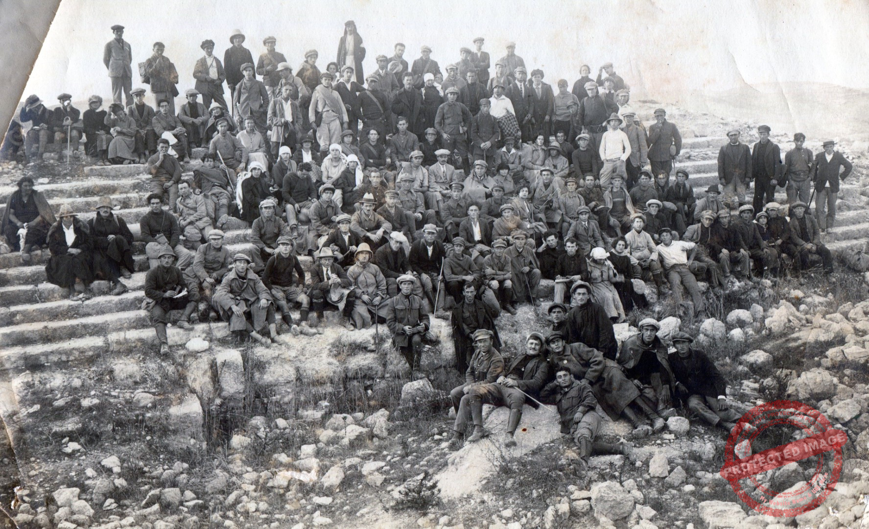 קבוצה ענקית של צעירים וצעירות בזמן טיול לסבסטיה, 1922. עפ"י הכיתוב על גב התמונה, נקודת היציאה לטיול היתה בחדרה.