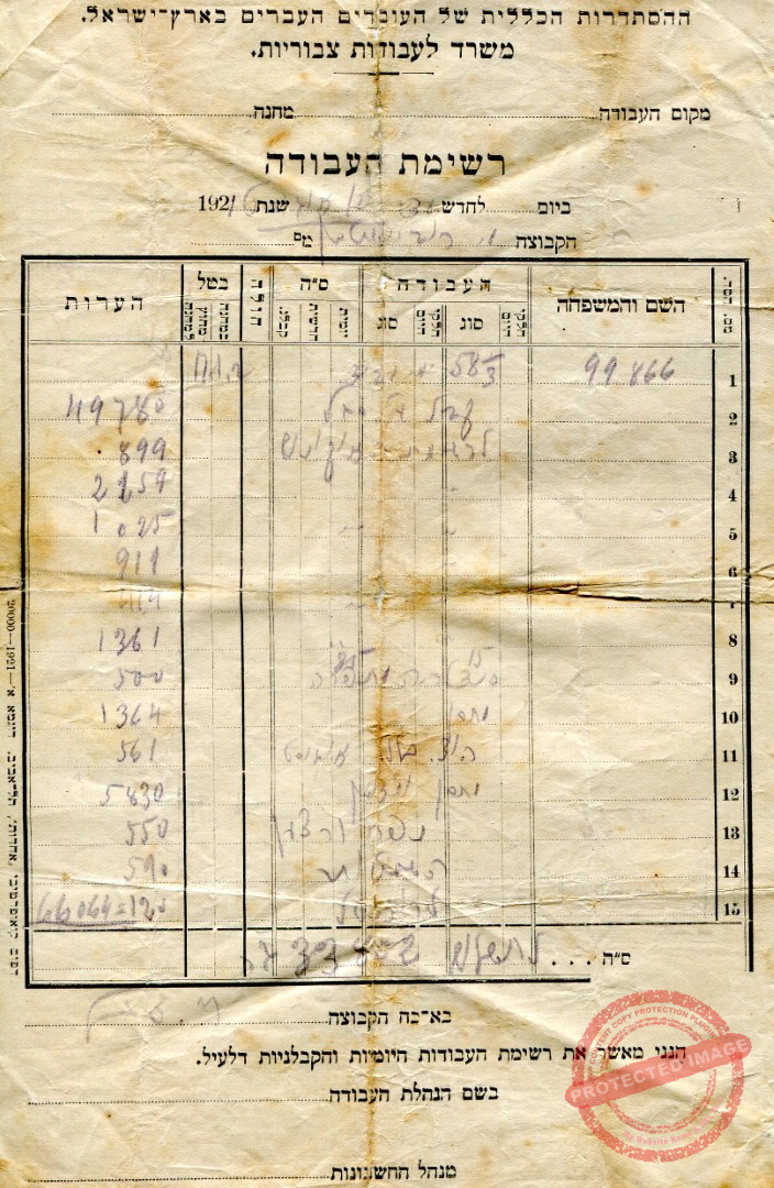 רשימת עבודה "עד אוגוסט 1921". "קבוצת כרמל" אשר תוך זמן לא רב תעלה להתישבות קבע בוואדי רושמיה שבכרמל, מועסקת אף היא בעת הזאת בסלילת כביש ג'דה - חיפה. הקבוצה רשומה עדיין כ"קבוצת מ. רובינשטיין" (מרדכי רובינשטיין), חתימת נציג הקבוצה ר. סגל בתחתית. בצד ההכנסות בחשבון - ימי העבודה, ובצד ההוצאות - סנדלריה ומתפרה, נפח ורצען וכדומה.