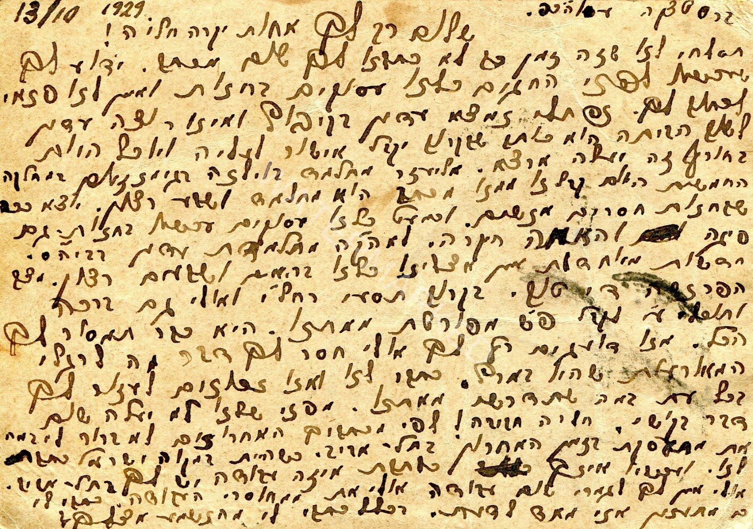 13 באוקטובר 1929, גור אריה כותב לאחותו, ומוסיף…