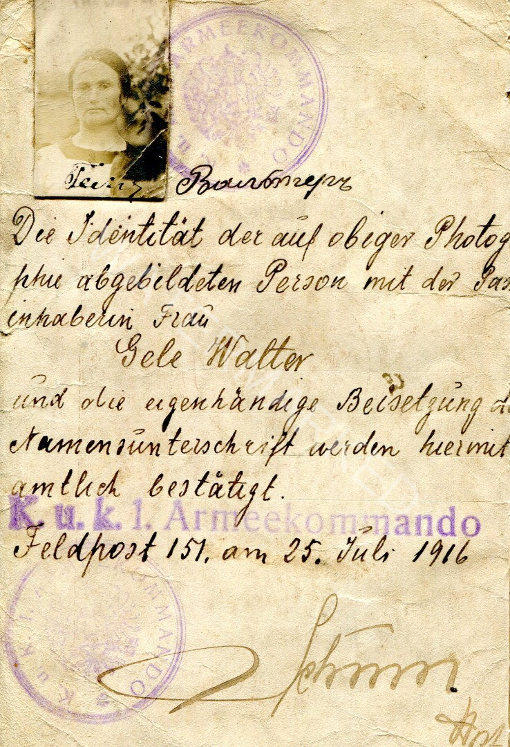 ברסטצ'קה תחת כיבוש אוסטרי וגילה ולטר ובנה מסתלקים מאזור הקרבות: תעודת מסע ע"ש גיילה ולטר המאשרת את זהות האדם שבתמונה. כמו כן, חתימת ידה של נושאת התעודה אשר מאומתת בזאת אישית ע"י מפקד היחידה הצבאית של הוד רוממותו הקיסר. דואר צבאי 151, ניתנה ביום 25 ביולי 1916.