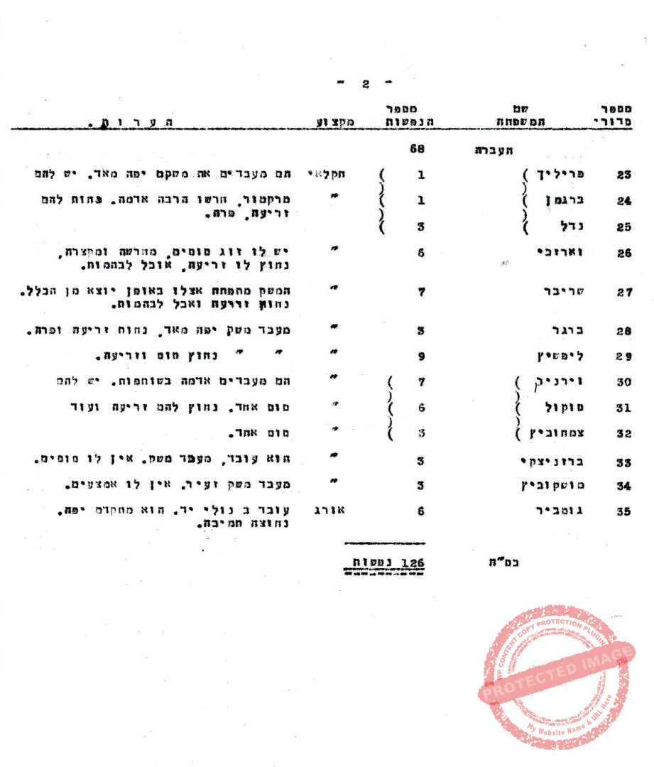 למען הסר ספק (בגלל איות או הגיה לא ברורים), להלן שמות המשפחה של המתישבים (שני דפי המסמך): ויינברג, גולדשטיין, מרגלית, שמידט, לפלר, קפלן, סרברניק, אפלבום, קסוינר (לימים עופר), אנגל, גרינשפן, זילבר, טורנר, זוכובסקי, ציסטורזון, בירנבום, רוסאק, סלוצקי, זברקו, אורבך, ברלין, פרידמן, פרייליך, ברגמן, נאדל (לימים רותם), ורזאכי, שרייבר, ברגר, וירניק, ליפשיץ, סוקול, צמחוביץ', ברזניצקי, מושקוביץ, גוטביר.