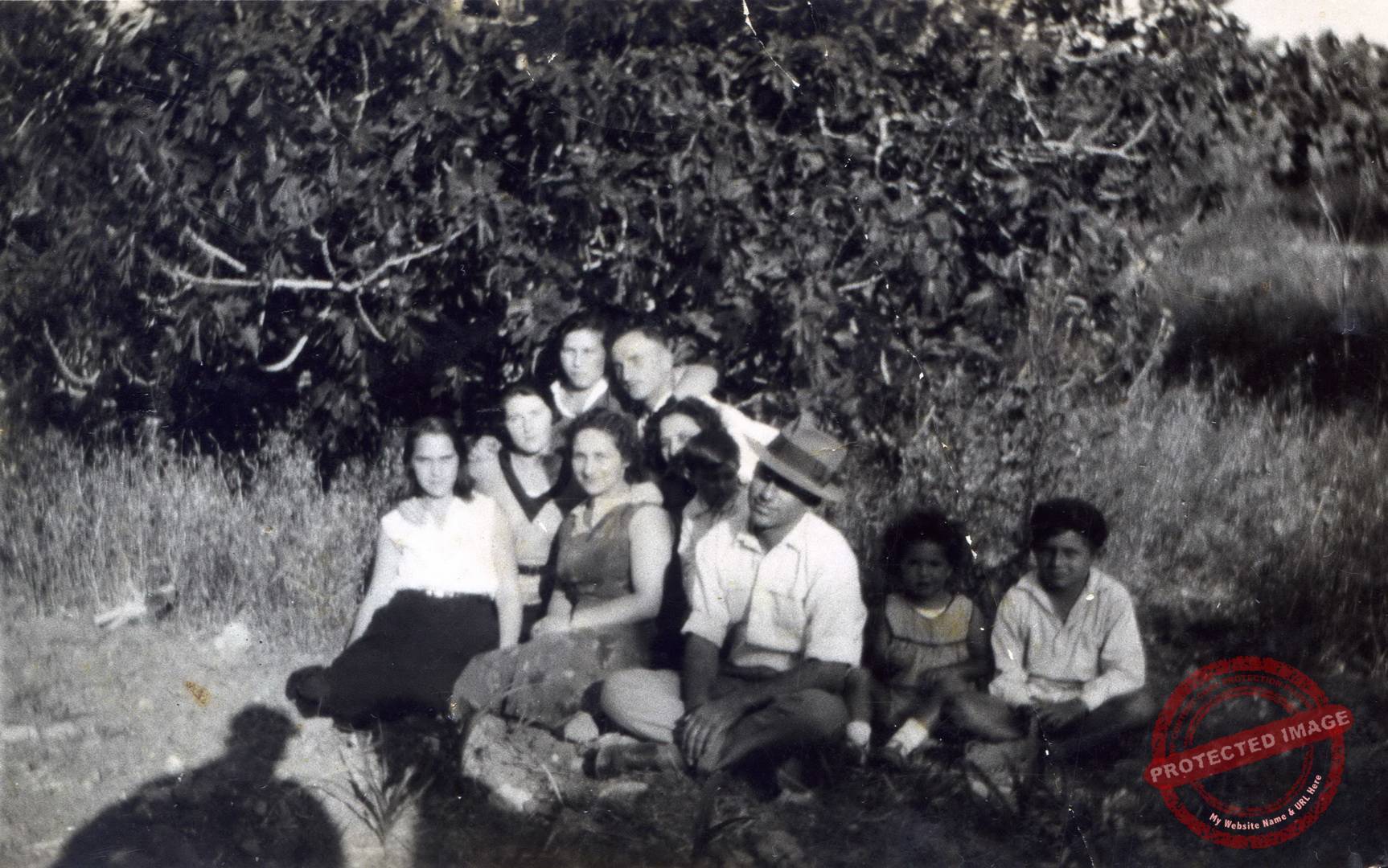 ג'דה מש' ברזניצקי פינקלשטין ועוד 8 באותו מעמד. למעלה מימין: משה לנגבורד וסשה פינקלשטין. בחזית מימין: הילד מרדכי קסוינר ולצידו תינוקת לא מזוהה, יוסף ברזניצקי (עם כובע) ומאחוריו בתו עדה ואשתו מירצ'ה, יוכבד לנגבורד במרכז. → ג'דה מש' ברזניצקי פינקלשטין ועוד 7ג'דה מש' ברזניצקי פינקלשטין ועוד 9 ←