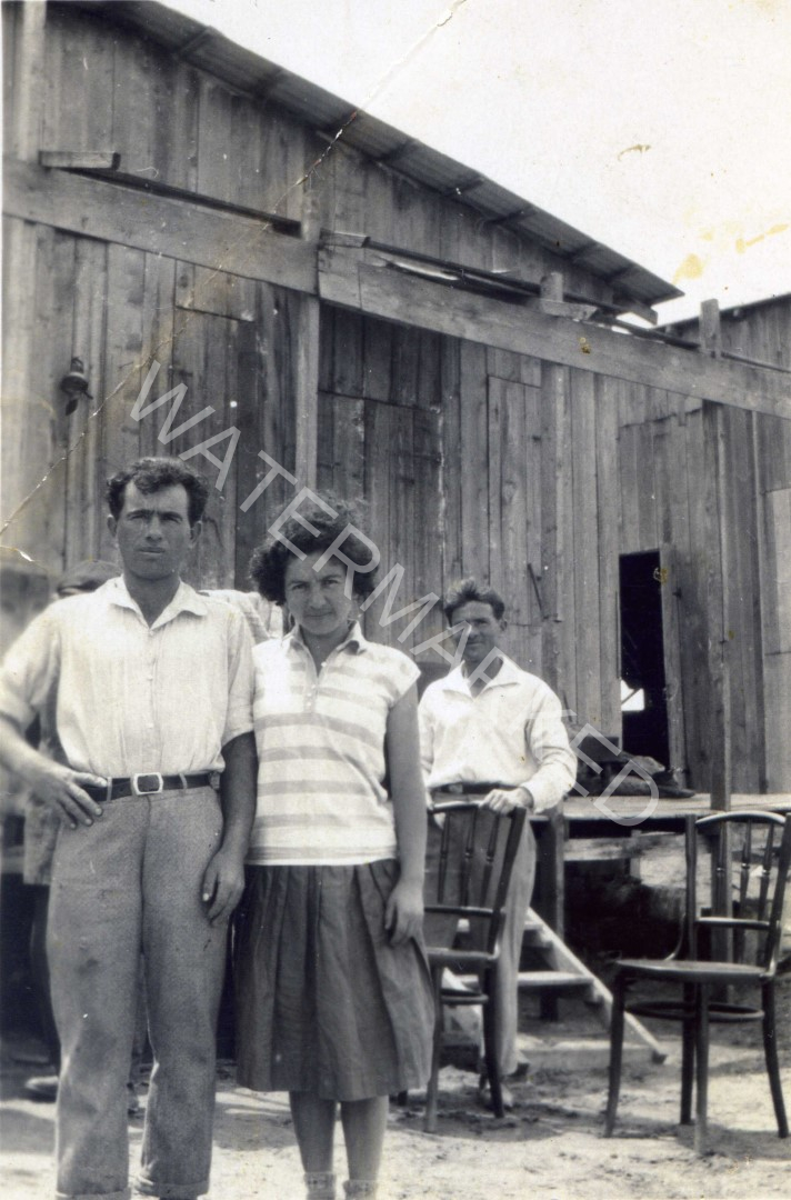 אח ואחות, משה ופרומה פרידמן בחזית ובעלה הטרי של פרומה, פנחס ויינברג, מאחור.