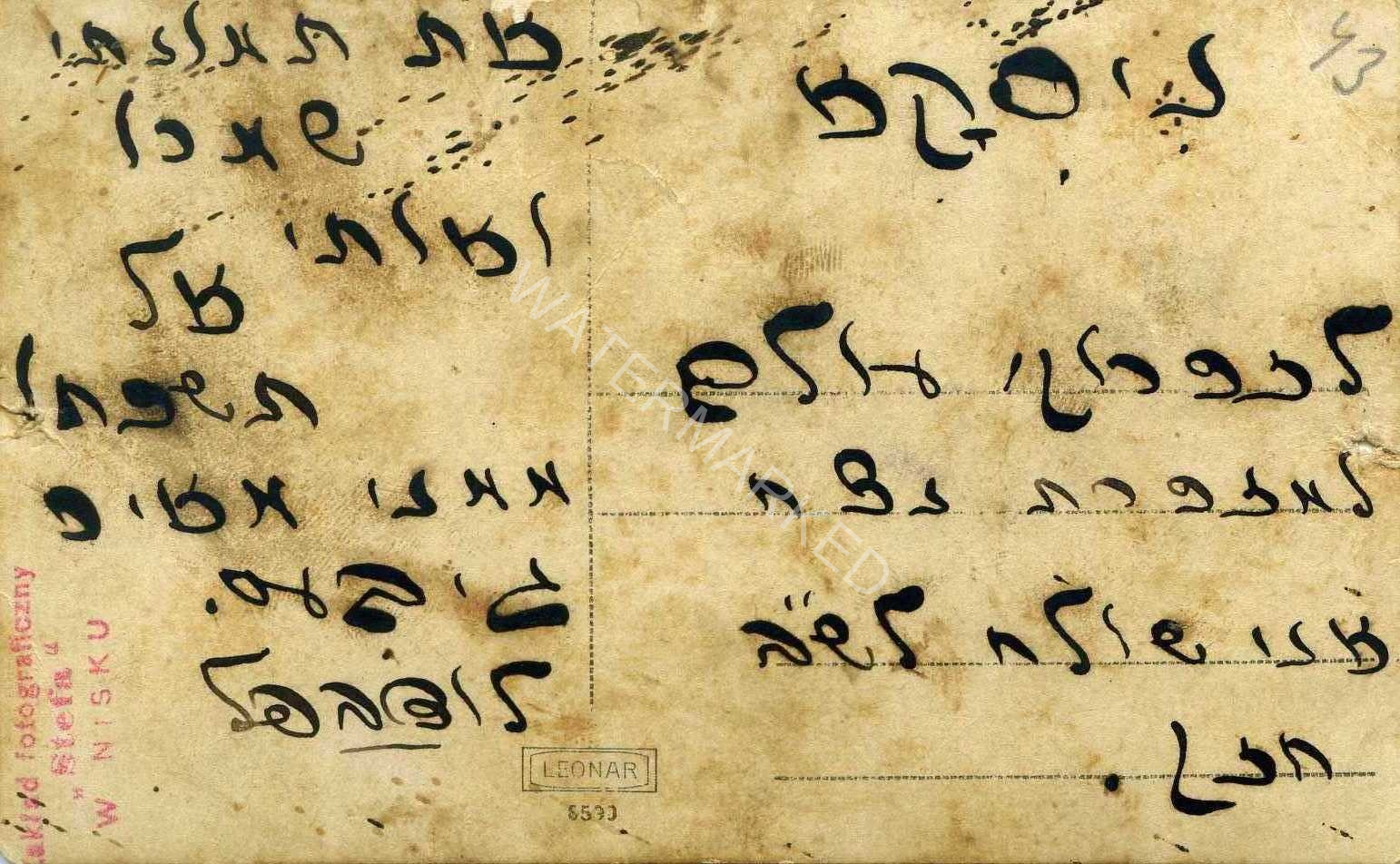 על גב התמונה: "לזכרוני עולם למזכרת נצח אני שולח לש"ב חזן. את תמונתי שמרו ואותי אל תשכחו, ממני, מאיר גיבעס, לדבפול". בכותרת למעלה כמו גם בחותמת הפוטו משמאל מופיע ניסקא וכן NISCU והאות W (קיצור ורשה), הוא רחוב ניסקא הנודע ברובע היהודי של ורשה. לעניינינו אין משמעות ייתר לזהות הנמען או הנמענת אלא לחשיבות הברורה שמייחס הכותב למעמד הזה. גיבעס הפטריוט הפולני, אשתו לימים רייקל ובנם אפרים, כמו גם אחותו צירל כגן, נספו כולם בשואה.