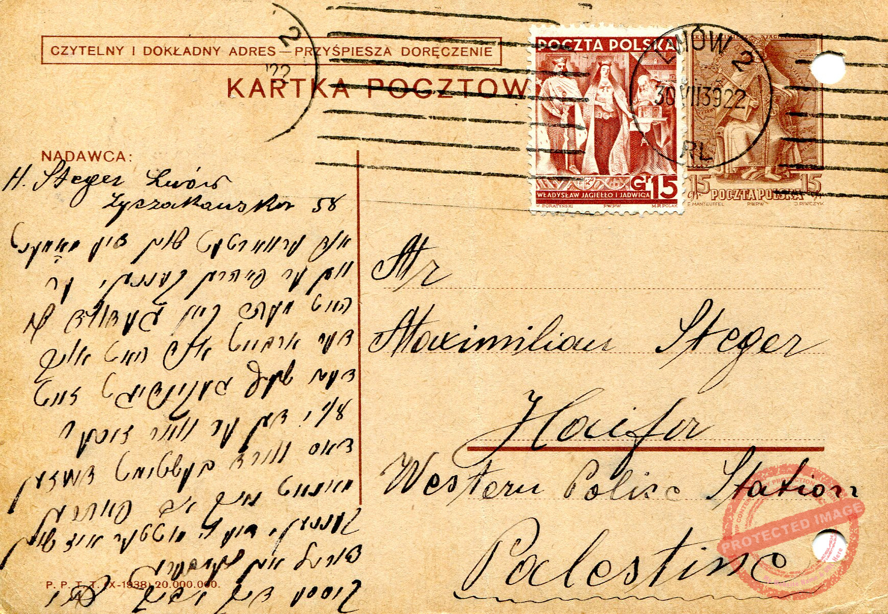הרמן (צבי) שטגר בלבוב (לעמברג) כותב לבנו בחיפה. חותמת הדואר מיום ה 30 ביולי 1939, מין הסתם טעות של פקיד הדואר ששכח להחליף את התאריך בחותמת (הגלויה נכתבה ב 31 לחודש). ומכל מקום, תחושה קשה של חוסר אונים נשקפת מהדברים של הכותב. ראו תרגום הטקסט והערות בנספח.
