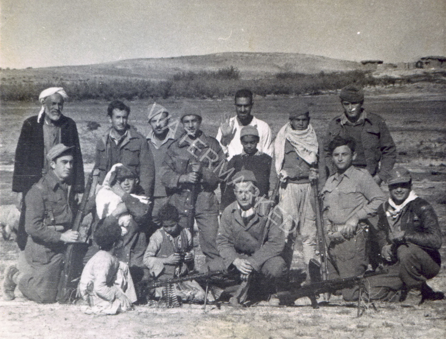 פגישה ידידותית עם תושבי הכפר במהלך סיור. מקלע שאטו מימין ומקלע מ.ג. משמאל. עומדים משמאל: אברהמל'ה פונסקה, יעקב אפריאט, מאיר נפתלי ויוסקה אוסטלוש מימין. אלחנן כורע שני מימין ומולה וינרסקי במרכז.