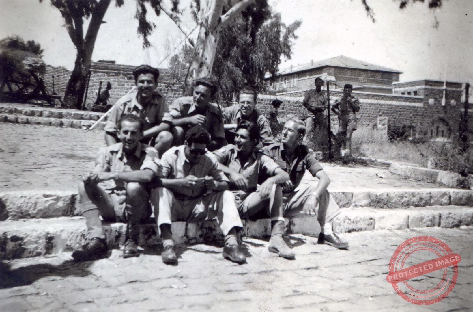 אלחנן למעלה במרכז. למטה משמאל: אריה אלבק, אשר בן שוהם, דוד גראד ויענקל'ה טרון (ירון). טרון שנפצע קשה בראשו בדיוק שנה קודם לכן בקרב על כפר סבא הערבית, חזר לאחר החלמה הרואית לשרות עם חבריו למחלקת הסיירים.