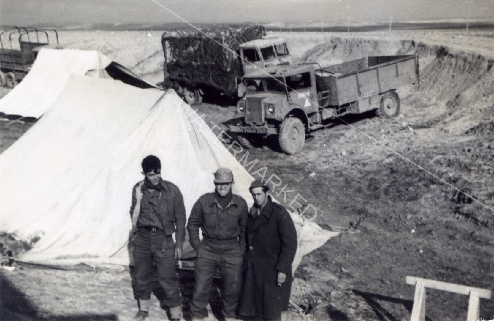 מלחמת השחרור יוסף גולדשמידט 10 חיילי גד' 32 במבצע "עובדה", 6-10.3.1949 משימת החטיבה במסגרת כבוש דרום הארץ, היתה פניה מבאר שבע מזרחה לכיבוש עין גדי, סדום ואזור יתיר בדרום הר חברון. כאן, משלט חואלפה (אזור קבוץ להב דהיום). י. גולדשמידט משמאל ואביב בטמן (אמבר) מימין. → מלחמת השחרור יוסף גולדשמידט 9מלחמת השחרור יוסף גולדשמידט 11 ←