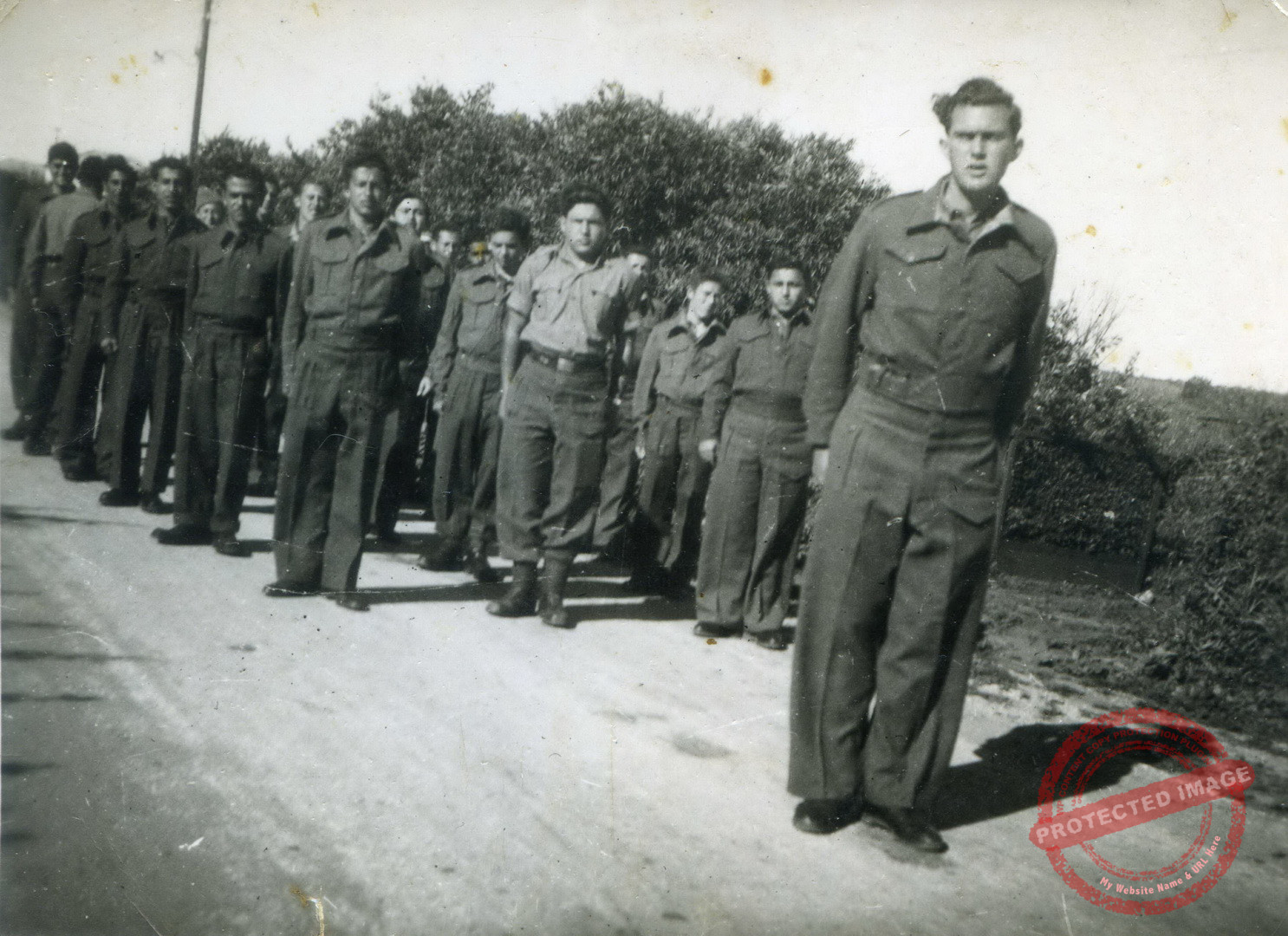 המ"מ יגאל סוקולסקי בחזית, מוביל את המחלקה בתרגילי סדר. המדים, משום מה, נראים קצת אחידים ויפים מדי למה שהיה לחיילים בד"כ באותה תקופה.