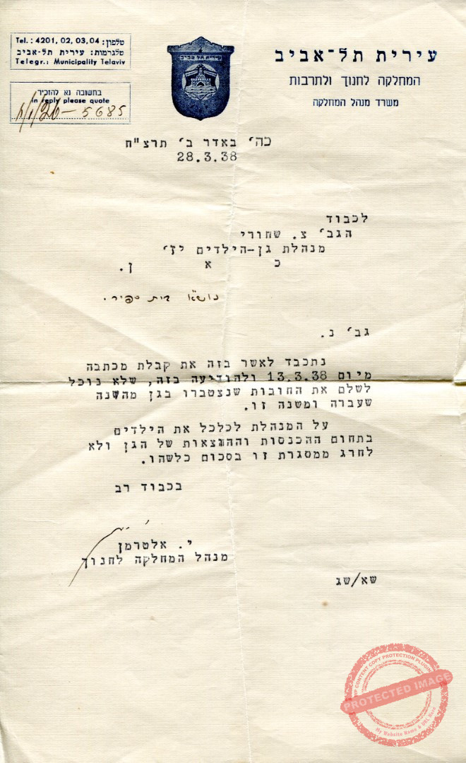 מכתב מח' החינוך של עירית ת-א לצפורה שחורי.…